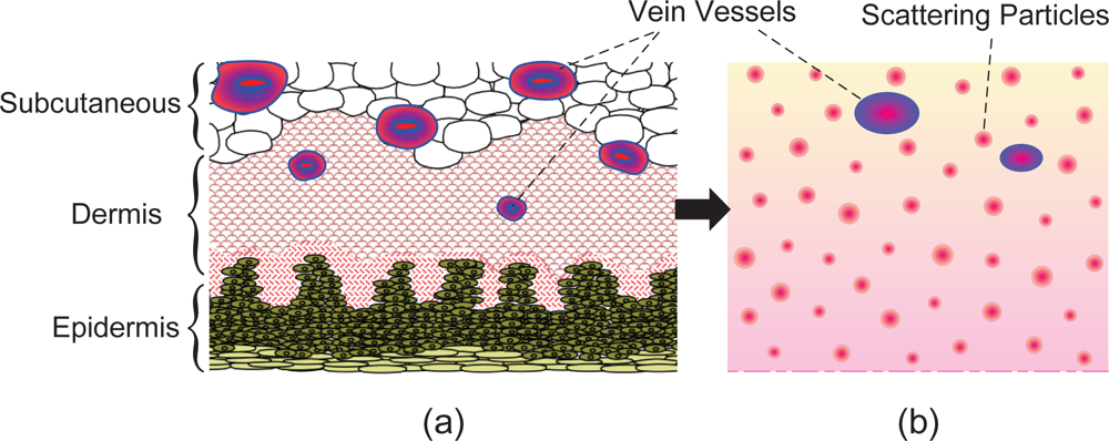Human skin is known to be an inhomogeneous, multilayered tissue containing epidermis, dermis and subcutaneous layer, as shown in Figure 6(a). But at the molecular level, skin tissues are composed of a limited number of basic molecular species, and these molecules are composed of optically similar chemical units [2]. Moreover, the ensemble of light-skin interaction homogenizes the optical behavior of biological structures. Thus, the skin can be viewed as a medium with a random but homogeneous distribution of scattering particles over its thickness [26], as shown in Figure 6(b), and then the scattering coefficient of the skin tissue here can be assumed to be constant.