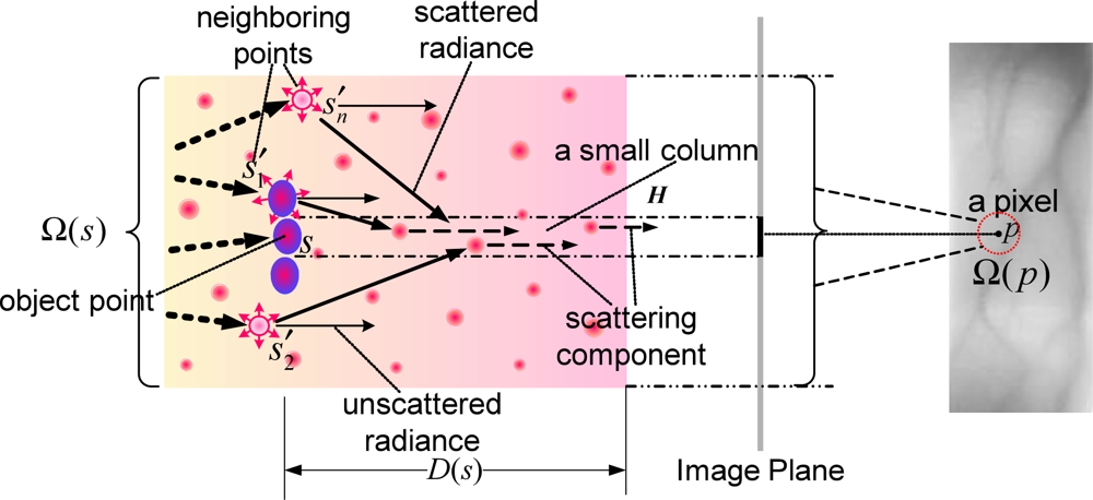 Assume that H denotes a small column in the skin tissue corresponding to a beam from the object point s to a point p on the image plane (each pixel corresponds to a small column), then the neighbor points (s′i ,i = 1, 2, ⋯ ,n) around s can be viewed as the local background radiation sources, which would emit radiation into the column H and produce the scattering component of the transmitted radiation along H. Let the original intensity of a neighbor point s′i be I0(s′i), then the direct transmitted radiation of this point, that is the unscattered radiation, should be e−μD(s′i)I0(s′i). So, according to the energy conservation principle, the scattered radiation of this point should be (1 − e−μD(s′i))I0(s′i), where D(s′i) is the depth of point s′i in the skin layer. Thus, we can obtain the scattered radiation Ir(s) in H. Since the scattering directions are random, Ir(s) here is considered as an average of total radiation from overall neighbor points and rewritten as