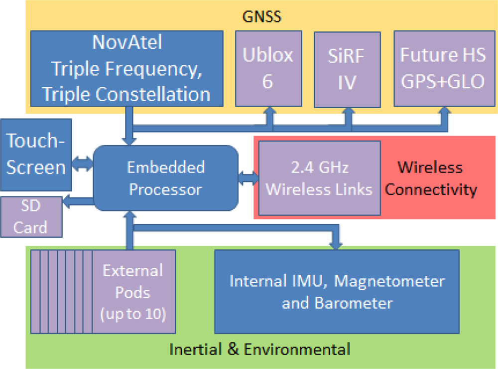 The NavCube has been designed to carry a wide variety of navigation sensors including accelerometers, gyroscopes, barometric pressure sensors, magnetic field sensors and future sensors including wheel speed sensors. Modularity has been emphasized where possible to allow the study of a variety of cutting edge sensors, with the option to exchange these as future developments in sensor technology occur. The primary strategy for obtaining this modularity was the subdivision of the system into core components and peripheral sensors. The block diagram of Figure 1 shows the modular/external elements of the system in violet, including the connection points for up to ten wired external sensors.