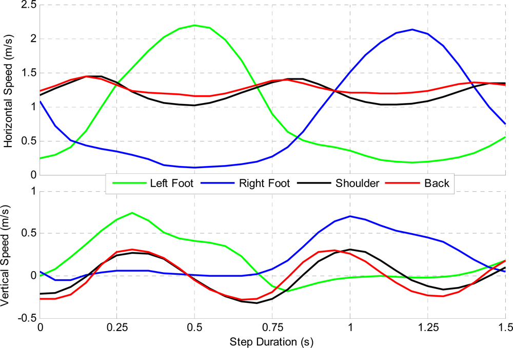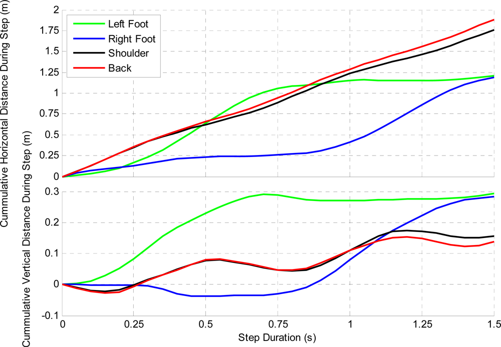 The hiker hiked 3.5 km and ascended 700 m vertically in 68 min and took approximately 2,750 steps (one step is from heel lift to heel lift of the same foot). Each step length and velocity was averaged to determine a nominal step profile and is shown in Figures 10 and 11. The left foot was used to determine the start and end of each step. Figure 10 shows the displacement of each ASP, both horizontally and vertically. Each profile varies slightly due to uncorrectable errors, but these errors are limited to a few centimetres. It can be derived from this figure that the hiker has an average step height of 29 and 30 cm and a step length of 119 and 121 cm for the left and right feet while hiking. The back and shoulder sensors are in close agreement, but vary likely due to the user bending forward at steeper inclines.