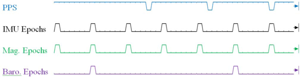 Within the ASP, the IMU, magnetometer and barometer timing is driven by a custom timing and data controller. This controller ensures that the 100 Hz IMU, 100 Hz magnetometer and 25 Hz barometer data has a near zero delay between sensors. Additionally, the controller steers the sampling train of all sensors such that the epochs of the IMU and barometer coincide with the next predicted PPS event. As shown below in Figure 4, the steering process takes 2–3 s to complete, and ensures that users with multiple ASP units driven by a UTC synchronized PPS train will have simultaneous IMU and magnetometer samples within ±100 μs. Barometric pressure sample times are similarly steered to maintain their alignment to IMU/magnetometer sample epochs. However, as is depicted in the timing diagram below, the epoch of barometric sensor output is not steered into alignment with expected PPS events.
