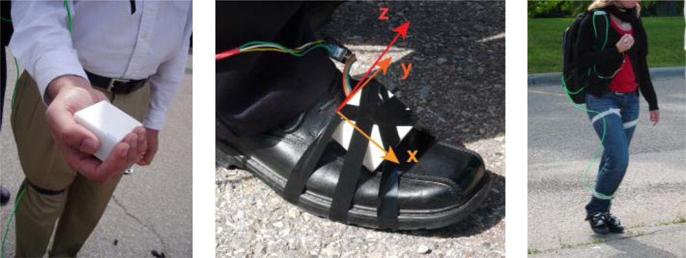 Among the first category are optical tracking systems that calculate the position and orientation of markers rigidly attached to the body, which are readily available in laboratories (e.g., [27–29]). They often use real-time digital photogrammetry and optical triangulation techniques to track the markers. A classical biomechanical application of these systems is the measurement of the exact nature of human body segments during motion. Completed with laser scanning or marker free-technology [30], the measurements, which are constrained in a specific volume, can also be used for industrial metrology (e.g., 3D modeling of automotive parts). Unfortunately, constraining the activity or body of interest to a specific location and area limits the applications range. Thus IMUs, members of the second category, are principally tri-axis sensors integrated on a single main circuit board, which has its own power management and data logging system. The MPU-6000/6050 product family of tri-axis accelerometer and gyroscope from Invense [31], the tactical grade ten degrees of freedom inertial sensor ADIS16375 from Analog Devices [32] or the iNErtial MOdule V2 from STMicroelectronics [33] are examples of these IMUs. Some more advanced solutions comprise a logging system for recording time synchronized data from multiple IMUs attached to the body along a distributed architecture. Widely used in Europe, the products based on inertial sensors proposed by Xsens are recording synchronized data from multiple IMUs. They provide different options for mounting the sensors on the user’s body and are principally oriented toward the use of accelerometers and gyroscopes, especially with the six degrees of freedom MTx IMU [34]. Solutions for using magnetic field data and GPS signals are also available.
