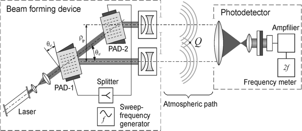 A laser beam passes sequentially through two acoustic cells, PAD-1 and PAD-2, whose medium density is varied under the influence of ultrasound waves from a sweep-frequency generator. The acoustic waves produce a phase grating on which laser radiation is diffracted. With the help of collimators of a beam forming device, further referred to as BFD, and diffracted beams are directed towards the atmosphere path, where they produce an interference pattern in the region of mixing. Characteristics of the optical system and positioning of the optical elements are chosen so that polarization of both beams and their intensities are similar. A photodetector registers and separates the received signal frequency, which uniquely correlates with direction to BFD.