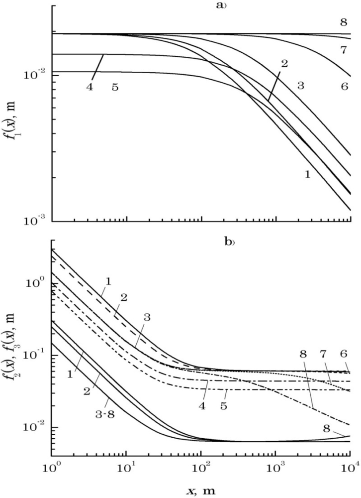 Curves 1, 2, and 3 indicate the influence of λ on f2(x) and f3(x): 1 – λ = 0.51, 2 – 0.63, and 3 – 1.06 μm (in this case, a0 = 2 mm, ρk = 2 cm, v(x) = 0.1, Cε2 = 10−16 m−2/3), curves 3, 4, and 5 are calculated, respectively, for the following values of the interference contrast v(x): 0.1 (3), 0.3 (4), and 0.5 (5) (other parameters are constant: λ = 1.06 μm, a0 = 2 mm, ρk = 2 cm, Cε2 = 10−16 m−2/3), while curves 3, 6, 7, and 8 are calculated for different levels of dielectric permittivity fluctuations of turbulent atmosphere Cε2: 10−16 m−2/3 (3), 10−15 m−2/3 (6), 10−14 m−2/3 (7), and 10−13 m−2/3 (8) (λ = 1.06 μm, a0 = 2 mm, ρk = 2 cm, v(x) = 0.1). Since the spacing ρtr between the radiation sources producing the interference pattern, must exceed the value of f2(x) and be below the value of f3(x), it is possible to estimate acceptable values of ρtr within the 1–5 cm range from Figure 2(b) for path lengths from 20 m to 10 km.