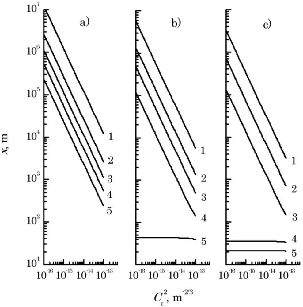 Equation (10) has been solved by the simple iterations method. Results of the estimates of the range of action of a LS are presented in Figure 3 for all values of the structural parameter of air permittivity fluctuations, valid for the near-water atmospheric layer [7,8], and for three values of interference pattern visibility and optical radiation wavelength λ = 1.06 μm. It is assumed that the laser radiation propagated along a horizontal path at the height of 10…20 m above the water surface.