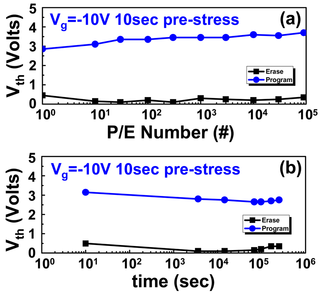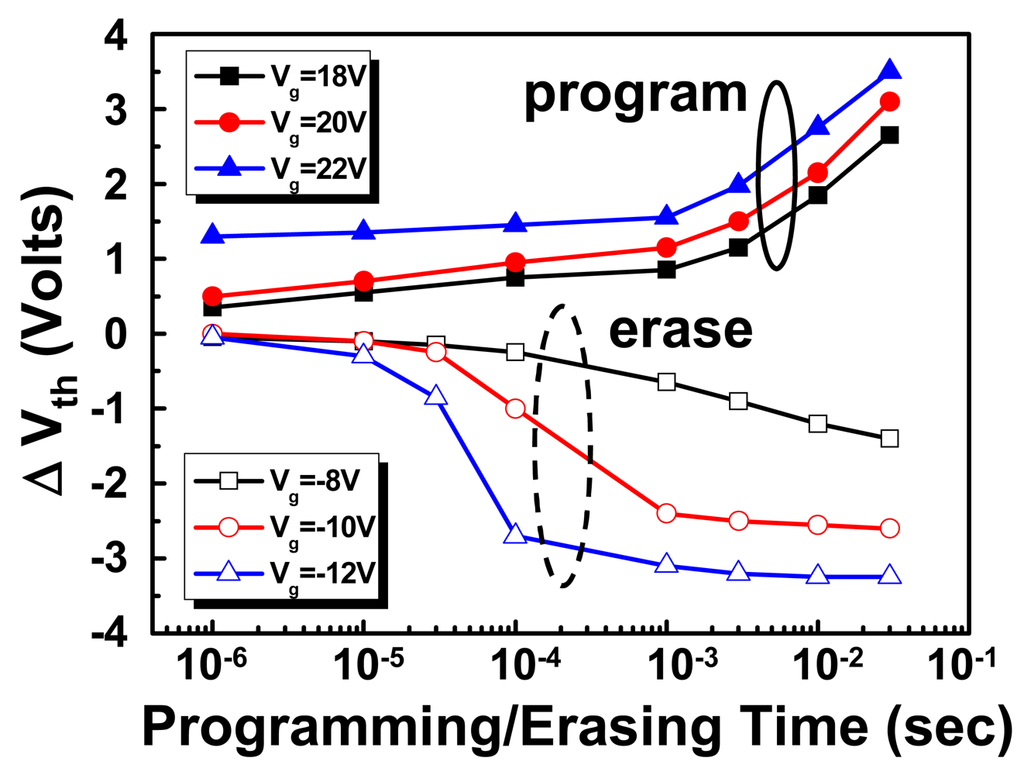 Figure 9 shows a comparison of the programming and erasing efficiency characteristics of the ONO-buried oxide poly-Si nanowire FETs. The Vth shifts are over 3 V when the programming/erasing time is approximately 10 ms at the adequate operation bias. Its endurance characteristics are shown in Figure 10(a). The programming and erasing Vg bias conditions are 20 V and −12 V, respectively. The programming/erasing cycles is shown to be more than 105 operation cycles with an acceptable memory Vth programming/erasing window. The data retention characteristics are also shown in Figure 10(b). The memory programming/erasing window is still larger than 2 V after a long storage period of 3 days. These reliability characteristics both demonstrate that the ONO-buried oxide poly-Si nanowire FETs have great potential as the EEPROM cell in embedded memory applications. This approach to Vth-adjustable nanowire FETs provides a possible System-on-Chip solution for self-alterable correcting and in situ recording.