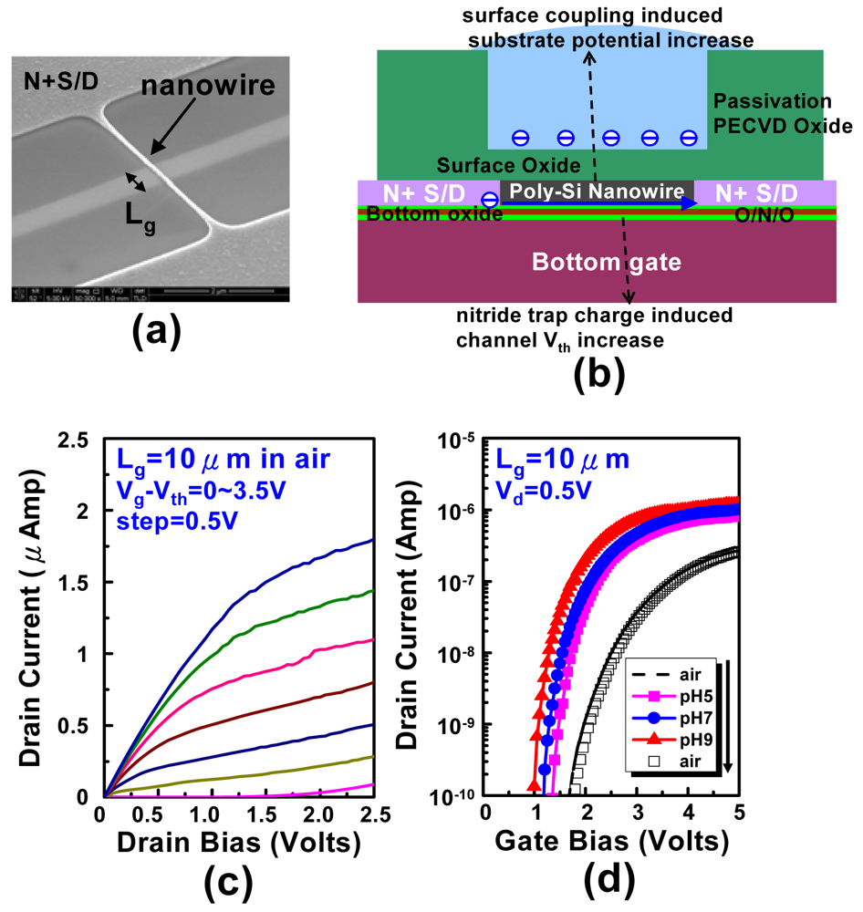 The device samples were manufactured on standard 6-in. p-type wafers. A proposed hybrid sensor/memory/CMOS poly-Si nanowire structure is illustrated in Figure 1(b). The bottom-gate poly-Si nanowire formation can be inserted specifically after metallization of the back-end process (BEOL). At the beginning, buried oxide was deposited on a substrate surface as the gate dielectric of nanowire FETs. A 50-nm polysilicon layer was then deposited using the CVD process. Subsequently, the poly-Si wire was patterned by the standard I-line stepper of the CMOS semiconducting process. By using reactive plasma etching for photoresist trimming followed by silicon etching, the nanowire dimension was scaled to a level of approximately 100 nm. A nanowire shrinkage technique using poly re-oxidation and oxide stripping was employed to scale down the nanowire width to less than 50 nm. A channel protection photoresist pattern was then formed by I-line lithography. The objective of the channel protection patterning was to keep the channel intrinsically from n+ source/drain (S/D) implantation, to increase nanowire FETs sensitivity. Subsequently, the n+ S/D implant was performed with a 1015 cm−2 P31+ ion beam at 10 keV to reduce the parasitic resistance of the nanowire. Thereafter, the channel protection photoresist was removed. Finally, the S/D dopant was activated by annealing treatment at 600 °C for 30 min in a N2 ambience. The top-view SEM image of the hybrid sensor/memory/CMOS circuit is shown in Figure 1(a). The fabrication flow requires only two extra masks and can be integrated into a standard BEOL process. Figure 2(a) shows the SEM image of the nanowire devices, and Figure 2(b) illustrates the operation mode diagram of the bottom-gate poly-Si nanowire device for ionic solution detection and nitride trap charge storing. Figure 2(c,d) plot the Id-Vg and Id-Vd characteristics of the poly-Si nanowire FETs. The device on-off ratio is approximately 105, and the subthreshold swing is 0.5 V/dec. The device threshold voltage was defined by the gate bias at a constant current: