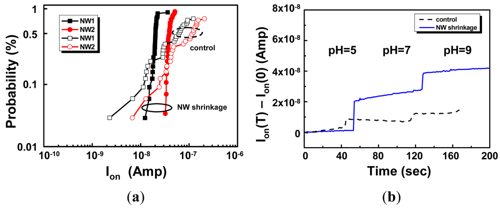 The mass manufacture of the semiconductors can simultaneously hold 32 dies in each 6-in. wafer. Figure 3(a) shows the statistics of a comparison among the electrical characteristics of various wire widths without and with the nanowire shrinkage process. The driving current Ion is measured, with a bottom gate of 5 V and a drain bias of 0.5 V, without any fluid on the nanowire surface. After the shrinkage process, the statistical plot shows less variation tailing for the improvement of PR trimming-induced surface roughness. Because device-to-device variation can be controlled significantly using the shrinkage process, pH sensitivity testing or memory characteristics in this paper are completed for individual nanowire devices, for fair comparison. On the side, the surface adhesion stress of fluidic cell spatial deflection [19] can also be aligned for nanowire structure uniformity. Figure 3(b) displays Ion versus time data as phosphate buffer solutions, with pH levels of 5, 7, and 9, which were sequentially delivered onto the nanowire sensors without surface treatment. The nanowire shrinkage split has a high Ion change caused by the large surface-to-volume ratio. The functionality of the poly-Si nanowire sensor can improve Ion accumulation distribution, and further enhance electrical pH sensitivity. Thus, the pH sensors of the poly-Si nanowire FETs not only have a higher manufacturing production yield, but also have a greater tolerance for the signal-to-noise ratio [20], for future single-chip system integration of nano-sensors.