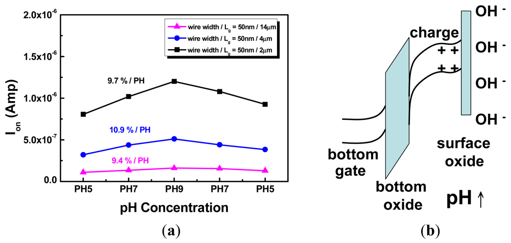 Figure 2(d) also shows the Id-Vg curves of the n-type poly-Si nanowire FETs in different pH solutions flowing without surface treatment. The testing sequence is indicated by the arrow. No I-V degradation is present after pH testing, and it displays an obvious Vth decrease and Ion increase with a rising pH value. The superior pH sensitivity (>100 mV/pH) is an opposite property and beyond the Nernst limitation (60 mV/pH) to ion-selective FETs [21,22]. The Ion increases and returns to its original value as the pH value rises from 5, 7, and 9, and reverses sequentially (Figure 4(a)). Consequently, the positive current shifts (10%/pH) are repeatable in the n-type poly-Si nanowire sensors. Figure 4(b) shows the schematic band diagram of the nanowire sensor to explain the Ion increase. The bottom-gate FETs' electrical behavior could be controlled by the substrate ionic concentration coupling induced the channel substrate potential modification [23]. The surface oxide coupling effect enables the nanowire substrate potential to have an opposite polarity from the ionic strength of the pH solution. The threshold voltage Vth of the poly-Si nanowire FETs determines the current flow in the nanowire channel, which can be described as in [24]: