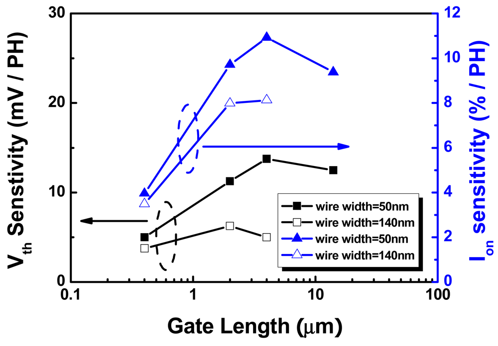 This work also evaluates the pH sensitivity of the poly-Si nanowire FET sensor responses at various nanowire geometries. Figure 5 shows the driving current sensitivity and Vth shift with different pH solutions in various nanowire widths and channel length conditions. In the nanowire width direction, narrower width devices have higher pH sensitivity, which is consistent with most previous studies [25]. However, a short channel split did not show apparent pH sensitivity in the experiment of this paper. The short channel devices had a smaller intrinsic channel area, and the rest of the nanowire was doped with a heavy S/D dopant to reduce parasitic resistance of the nanowire and the influence of noise. The channel-coupling effect is attenuated at the heavy-doped nanowire region, thereby reducing the pH sensitivity of the short channel nanowire. Although short channel devices have large current shifts in different pH solutions (Figure 4(a)), the higher conduction current from the short channel device loses the nanowire potential control ability and pH sensitivity. Thus, the proper geometrical design to optimize device sensitivity and noise tolerance is a crucial consideration in the improvement of detection sensitivity in nanowire FET sensors.