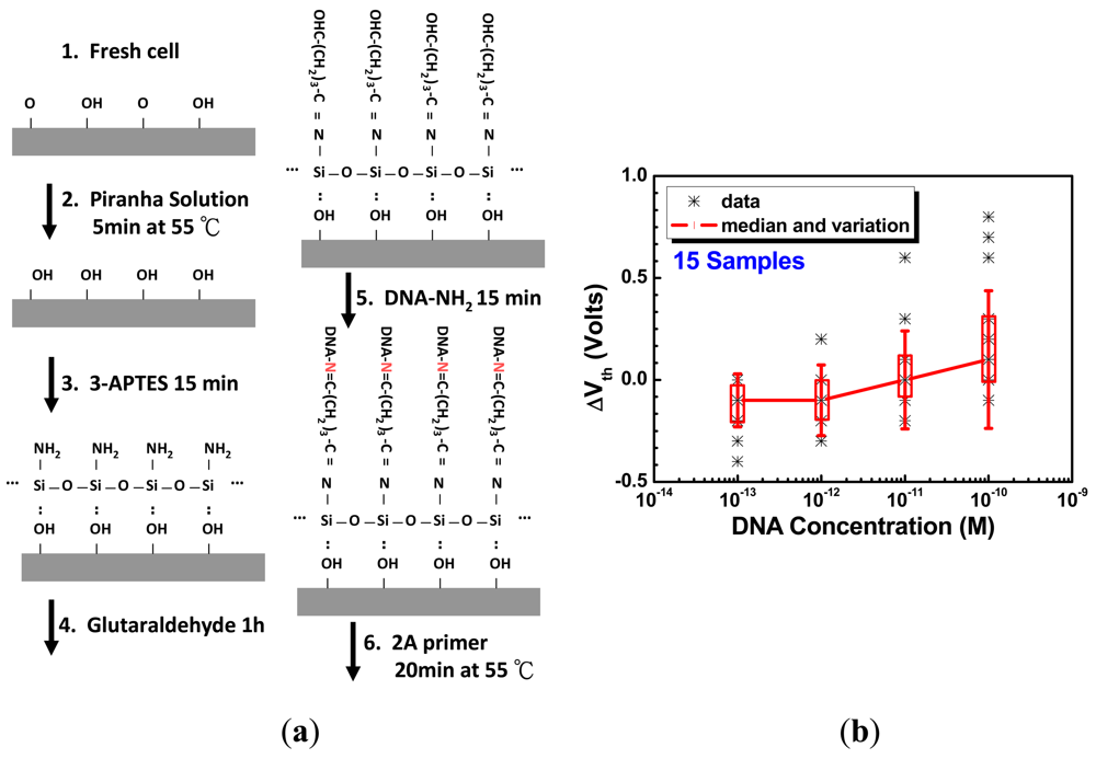 The primer DNA detection of the poly-Si nanowire FET sensors is also tested in this work. Figure 6(a) shows a schematic illustration of the poly-Si nanowire surface treatment steps for DNA concentration detection. First, the fresh nanowire surface was washed with piranha solution for 5 min to form a uniform OH bond. Subsequently, the 3-APTES solution was coated to link glutaraldehyde. After the series treatment process, the oligo DNA could be bound effectively on the nanowire surface to react with subsequent primer DNA. The Vth shift of the poly-Si nanowire FETs at various primer DNA concentrations is shown in Figure 6(b). Every condition indicates the median of the 15 devices at the same wafer, and the standard deviation is also shown. Approximately 100 mV of the Vth shift is still present as the primer DNA concentration is lowered to 10 pM. The concentration sensitivity is substantially higher than the conventional PCR limitation. This result demonstrates that the poly-Si nanowire FET sensors have high potential for DNA detection and application in gene engineering.