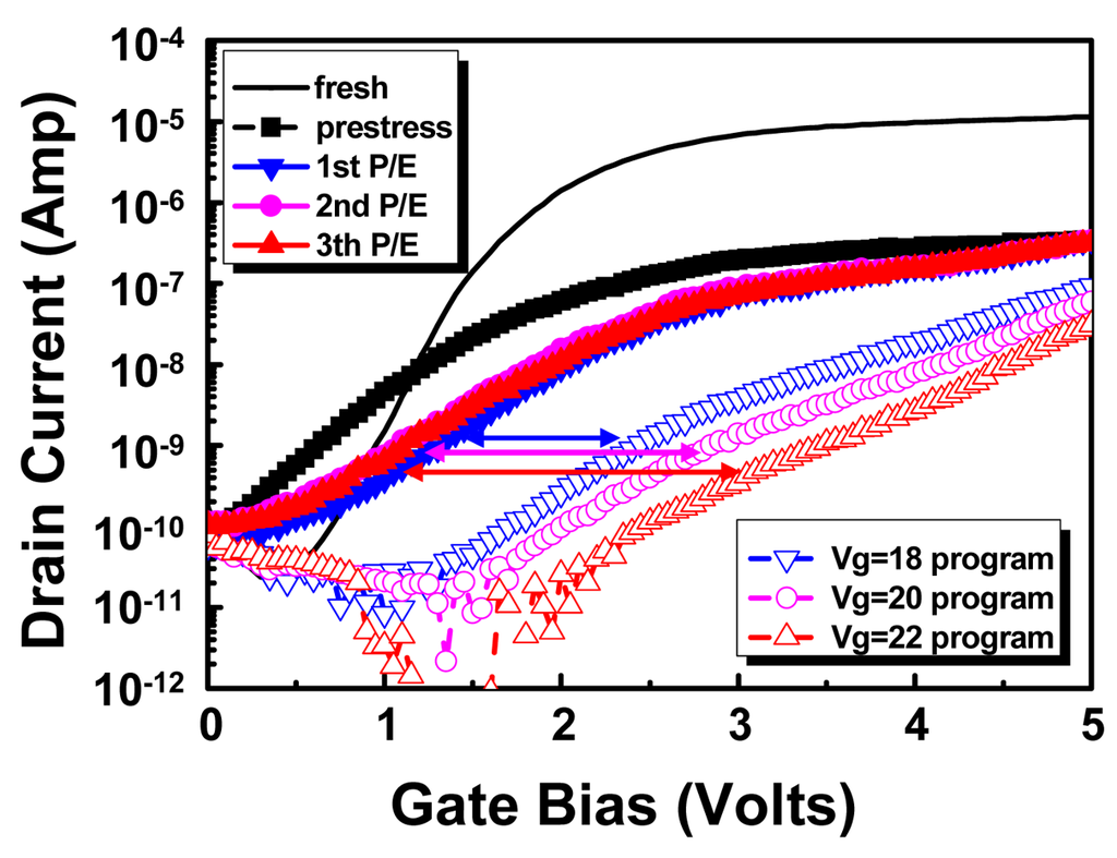 Specially designed ONO-buried oxide of the poly-Si nanowire was realized to obtain the charge storage layer of the memory application. In a high dielectric field, the nitride trap charge of the ONO-buried oxide can be filled or removed, and subsequently, the nanowire substrate channel potential would be modified. Figure 7 plots the Id-Vg characteristics of the ONO-buried oxide poly-Si nanowire FETs at different operation modes in a single nanowire device. After a short initial high negative gate bias pre-stress, the Id-Vg curve of the poly-Si nanowire FETs can be shifted to a relatively low Vth level because the trap charge of the buried oxide was neutralized. The Id-Vg curve can be erased effectively to the steady Vth level through a short erase pulse (10 ms), and Vth can be adjusted after achieving an adequate programming condition. Furthermore, the electrical characteristics of various operation conditions are reappearance.