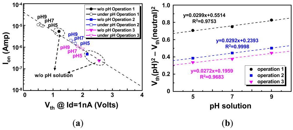 The pH testing of the ONO-buried oxide poly-Si nanowire FETs was also implemented at various Vth levels. First, we recorded the initial Vth level and operated the pH testing at the initial state, designated operation 1 (at erase state, Vg = −12 V). Subsequently, the ONO-buried oxide nanowire device was programmed to a high Vth level, and operated the pH testing at a high Vth state, designated operation 2 (at program state, Vg = 18 V). Finally, a higher programming bias, designated operation 3 (at program state, Vg = 20 V), was operated in the same device to obtain a higher Vth level, and preceded pH testing. Figure 8(a) shows that the Vth shifts of surface pH ionic coupling and nitride charge trapping follow the same Ion-Vth trend. Its pH sensitivity at a normalized scale Vth(pH)2-Vth(neutral)2 is plotted in Figure 8(b). Similar pH sensitivity slopes are in different Vth levels, and they are consisten with a previous pH ionic substrate-coupling model, as shown in Equation (3). The strongly Vth-adjustable nanowire device provides a consistent electrical response for self-alterable correction and memory-integrated application.