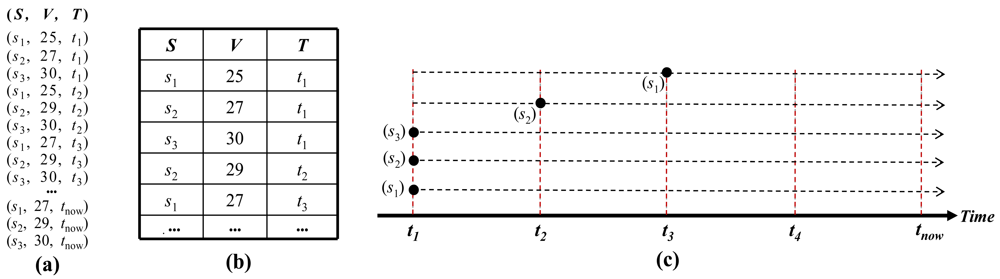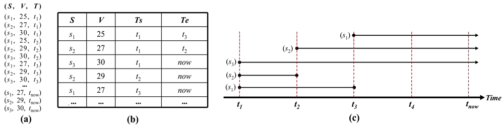In the TSI method, before inserting the data into memory, we compare the new value of the data with the previous value and if the value has changed, we update the data that are attached to the timestamp at which the value is changed. If the data has the same value as the previous one, the tuple's timestamp of this data in memory is maintained as “now”. Let the datasets of the incoming stream be denoted as <S, V, T> where S is the sensor identifier, V determines the measured value, and T is the timestamp. Additionally, let the table be <S, V, Ts, Te>, where Ts and Te are the start time and end time of the new value. Here, Te is “now” when the item's value is valid until the present time. Te will be updated with the timestamp at which the data is changed and, at the same time, a new tuple will be inserted into the table, whose timestamp is Ts. Figure 1 shows an example of the representation of the incoming data stream. Figure 1(a) illustrates the processing of the TSI method and Figure 1(b) represents the table whose tuples store the values of the data stream after they pass through the memory. Initially, at timestamp t1, the items s1, s2, s3 are inserted into the tables, and each one is associated with a memory value whose Ts is t1 and Te is “now”. Next, at timestamp t2, the end-time's value “now” of s1 is maintained; because the sampled value of s1 is still the same, i.e., 25. However, the Te of s2 at timestamp t1 is updated with t2, since s2 is sampled and its value has been changed from 25 to 27, so the new value 27 should be stored by inserting a new tuple into the table and giving the field Ts of this tuple the timestamp t2. In the same manner, at timestamp t3, the tuple of s1 is updated. Finally, when all the items of Figure 1(a) are inserted, the tuples in the table are represented as shown in Figure 1(b). We realize that in the case of s3, only one tuple is kept because the sampled values of s3 are constant from t1 to tnow. Figure 1(c) displays the timestamps of Ts and Te over the whole incoming stream.
