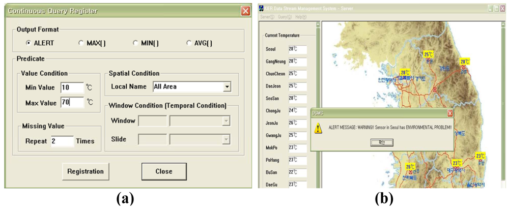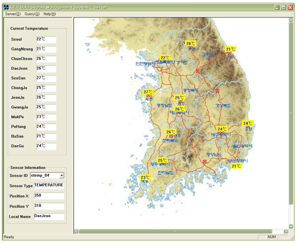 Figure 9 shows the interface for the weather monitoring system. The system displays the data collected from the sensors in real-time and then updates the value of the segment or inserts new tuples to represent the changed values after comparing the old values with the latest data in memory. Figure 10 shows the registering of a query to detect anomalous data. The query processor continuously generates the results when the temperature values measured from sensors which are less than 10 degrees or larger than 70 degrees in all areas. The users can register queries that allow them to be informed about any situation. Figure 11 displays the registering of spatiotemporal queries and their results. The user can enter the window range to perform the query continuously. The continuous query is closed when the current time arrives at the end point of the window range.