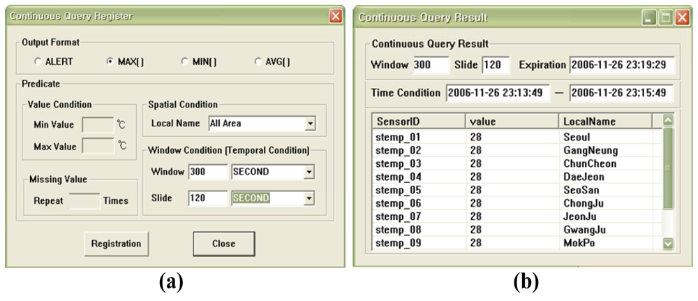 Query Processor: The query processor processes continuous queries as well as one-time queries on the data stream. The continuous queries are processed by checking the input data stream with predicates of a list of continuous queries registered in the Query Manager. A spatiotemporal query is also processed by checking the spatial information in the Metadata Repository depending on the query type.
