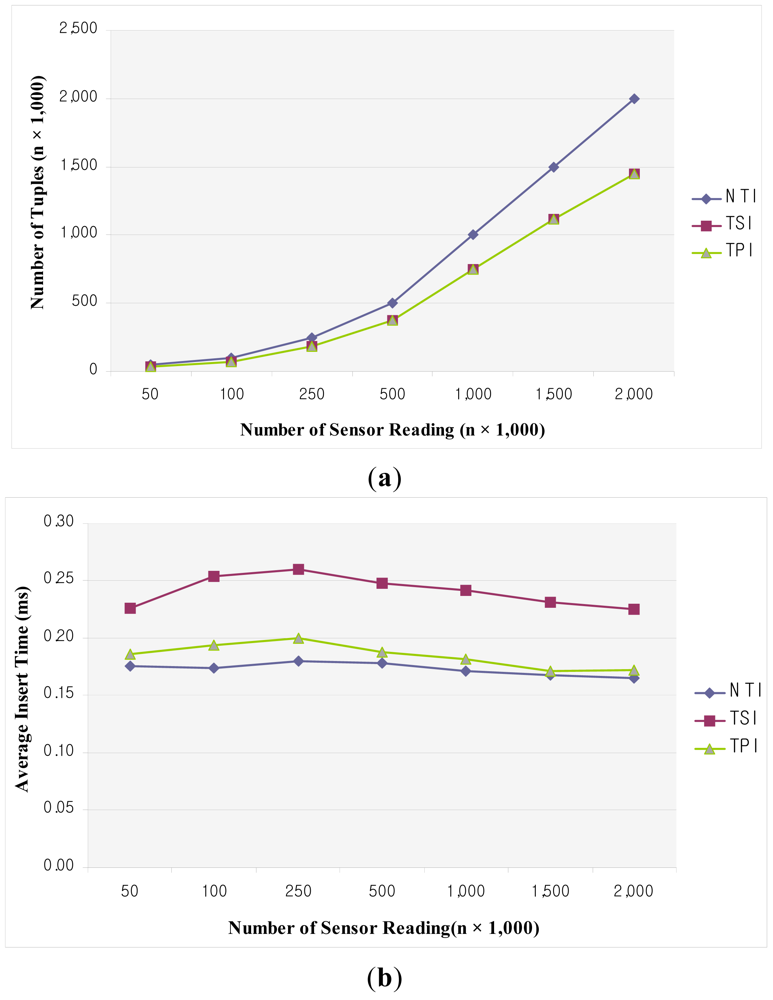 Figure 12(a) displays the number of tuples as a function of the number of sensor readings. Since the NTI method inserts all the data values from the incoming stream, the number of tuples stored increases in proportion to the size of the input stream. On the other hand, the TSI and TPI methods discard duplicate values and store the data just once if they do not change over time. Therefore, the number of stored tuples is decreased by about 30%, and both methods give the same number of tuples. Figure 12(b) shows the average insert time as a function of the number of sensor readings