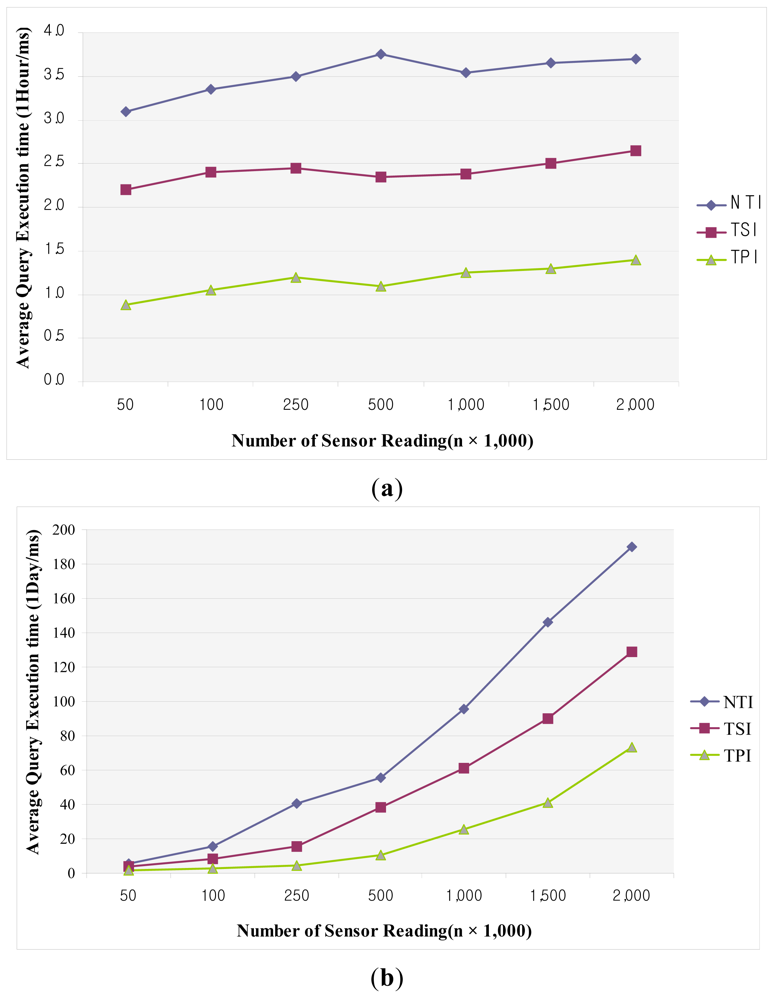 Figure 13(a) illustrates the average query execution time over a period of one hour as a function of the number of sensor readings. In this experiment, TPI gives the best performance among the various methods. TPI compares only the time-point included in the time-interval of the query predicate, which is a simple operation. Moreover, since the query is performed with a smaller number of tuples than in the case of NTI, fewer operations are required. TSI gives lower performance than TPI. Since TSI requires the time-segments to be compared with the given range query predicate for both the start time and end time, the query operation is rather complicated. NTI gives the lowest performance owing to the large number of operations on tuples required, as compared to the other methods. Figure 13(b) shows the average query execution time over a period of one day as a function of the number of sensor readings. As in Figure 13(b), TPI gives the best performance and NTI the worst. The query processing time is linearly increased with increasing data size. This is due to the number of disk accesses required in the case of historical queries, including a long time-interval.
