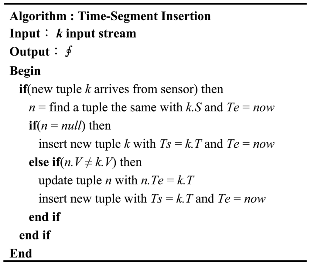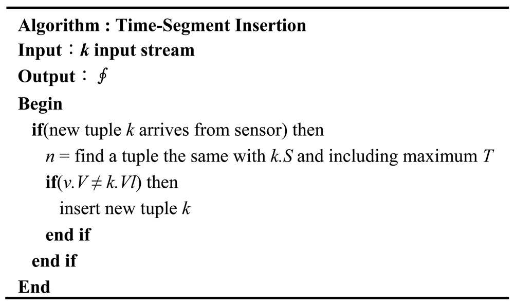 The TSI algorithm, shown in Figure 2, only stores those items whose measured values are found to have changed after comparing the incoming stream with that stored in memory. If the data stream has the same values as before, we discard the data without storing it in memory. The disadvantage of the TSI method is that it incurs additional overhead due to the update operation. The reason is that TSI has to update the lifetime of the tuple in memory with the time interval when the values are different from the previously stored values. On the other hand, if the sensor frequently transmits the same values for some timestamps, the operation to store the new values is not required. Therefore, the overhead caused by the update operation may be reduced. Moreover, the TSI method has the advantage that it can keep the values of the data without any loss of data and store the data stream in memory as much as possible.