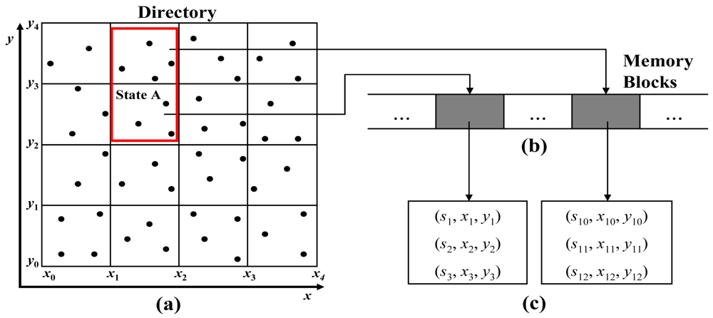 Because the fixed grid only requires sufficient memory space to store the pointers used for referring to the memory block, this structure uses only a small amount of additional memory. Moreover, the fixed grid has the advantage that it can filter the list of sensors in a query predicate in advance. In particular, for a join operation relating to the temporal predicate and spatial predicate in spatiotemporal historical queries, this structure can reduce the cost of the join operation.