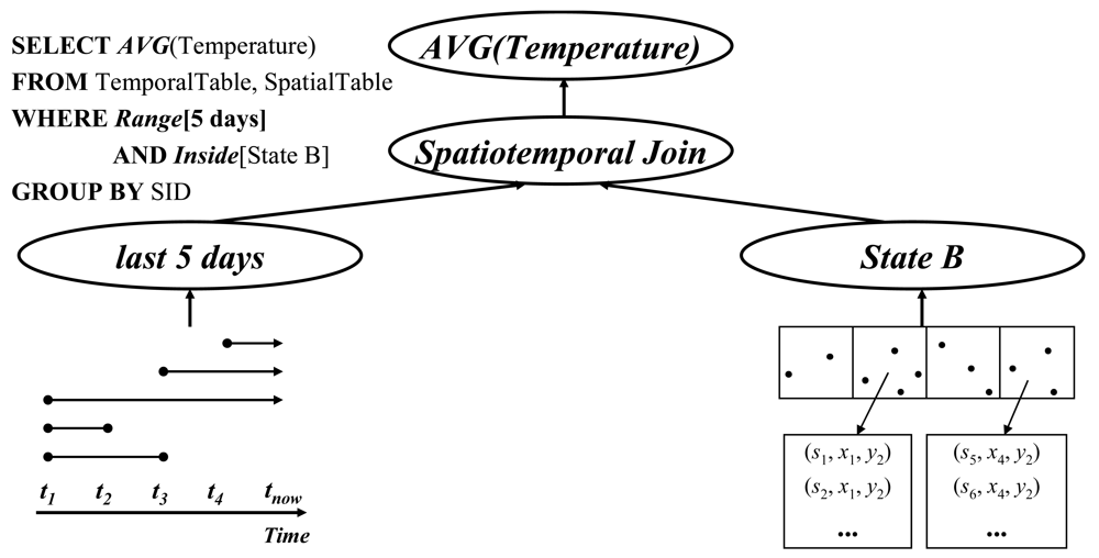 Queries on a sensor data stream mostly involve temporal, spatial, and spatiotemporal attributes. The problem is that a complex query such as a spatiotemporal query requires a join operation between spatial and temporal intervals. In this case, it is inefficient to join all the locations with the time-point. The solution mentioned in the previous section can reduce the cost of query processing by filtering the tuples and location before making the join operation: