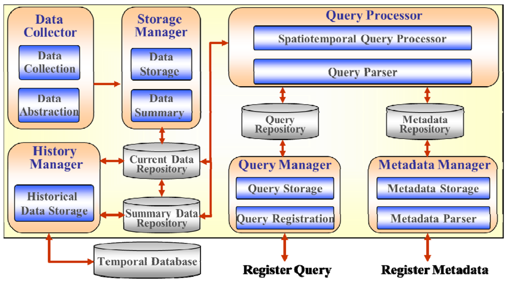 Metadata Manager: The metadata manager manages the metadata, which is composed of the spatial information and their specifications, etc. The locations of the sensors are stored in the Metadata Repository and are utilized for processing spatial and/or temporal queries.