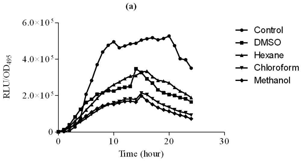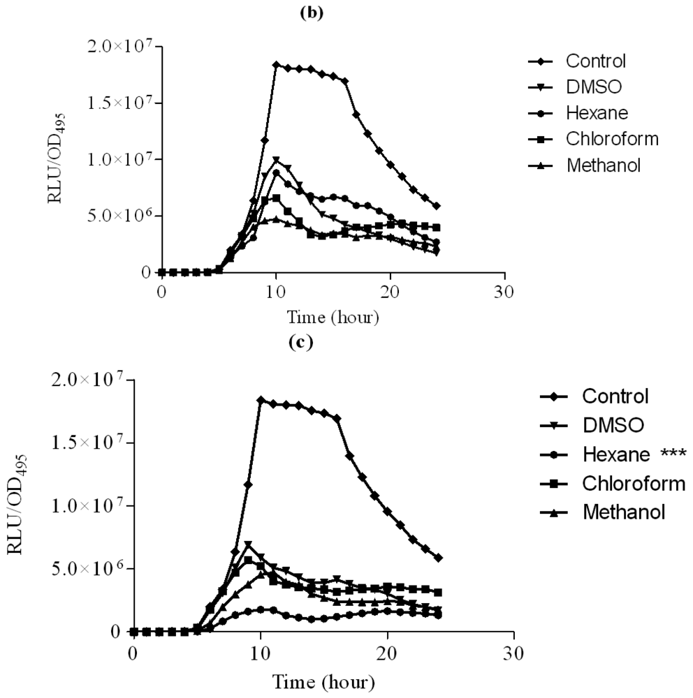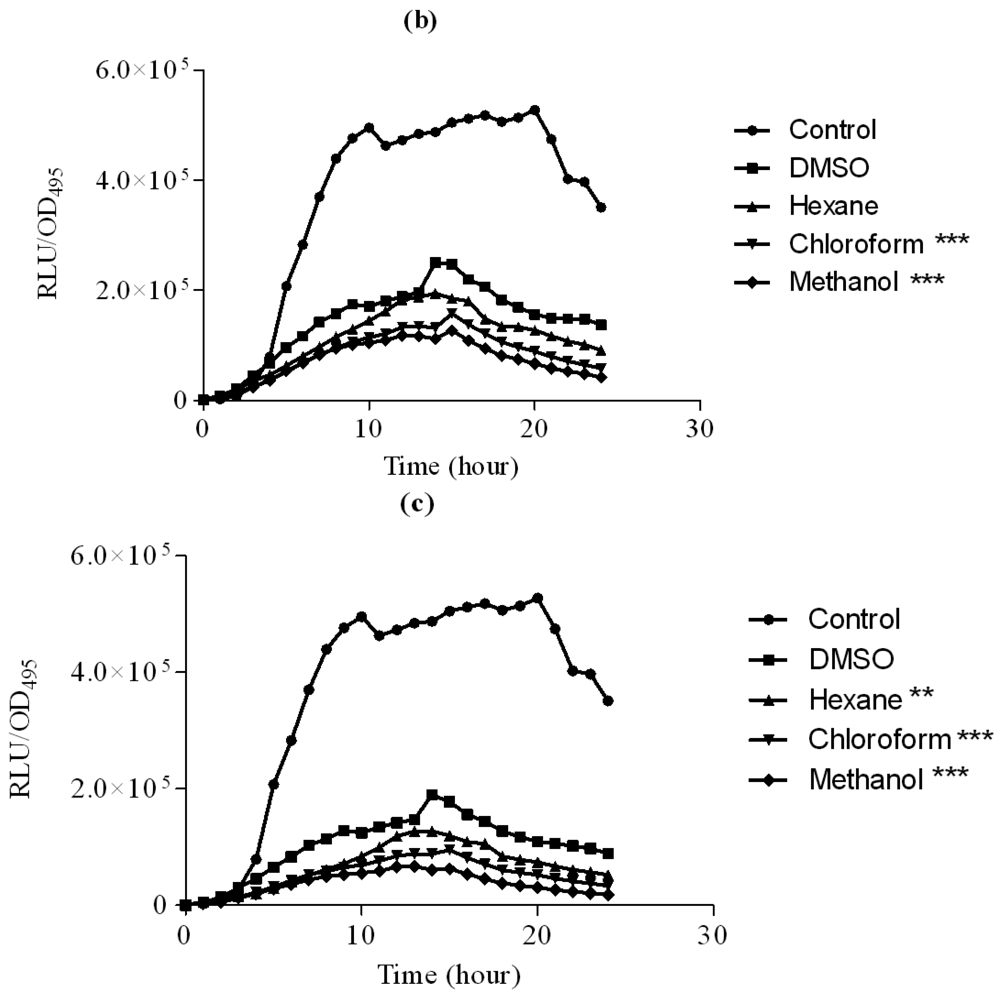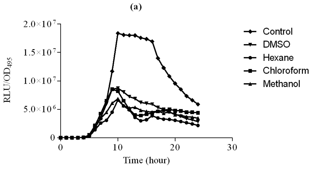 The hexane, chloroform and methanol extracts of clove were assayed using lux-based biosensor strains E. coli [pSB401] and E. coli [pSB1075] in 96-microtitre well plates. E. coli [pSB401] and E. coli [pSB1075] biosensor strains respond by the emission of light, preferentially to the presence of exogenous AHLs with acyl chains from six to eight carbons in length (such as 3-oxo-C6-HSL, C6-HSL and N-octanoylhomoserine lactone (C8-HSL)) or AHLs with acyl chains of 10–14 carbons in length, respectively [23].
