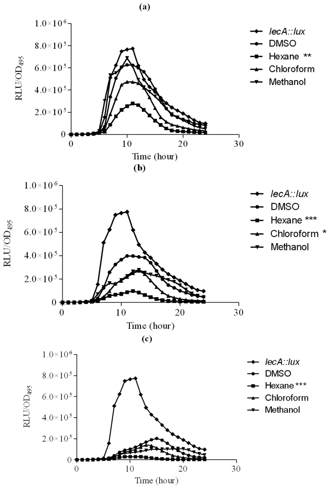 Hexane extract of clove showed significant inhibition of the P. aeruginosa PAO1 lecA expression as judged by the reduced bioluminescence of P. aeruginosa PAO1 lecA::lux fusion. However, other clove extracts only slightly inhibited the expression of the P. aeruginosa PA01 lecA::lux reporter fusion (Figure 4). This result suggests that P. aeruginosa PAO1 LecA virulence factor could be interrupted by the clove crude extract without affecting its growth. In these assays, all the data were analyzed using ANOVA and Dunnet's post test to compare the plant extracts (hexane, chloroform and methanol) as compared to the control (DMSO). Therefore, significant results shown are due to the effect of the plant extracts but not DMSO.