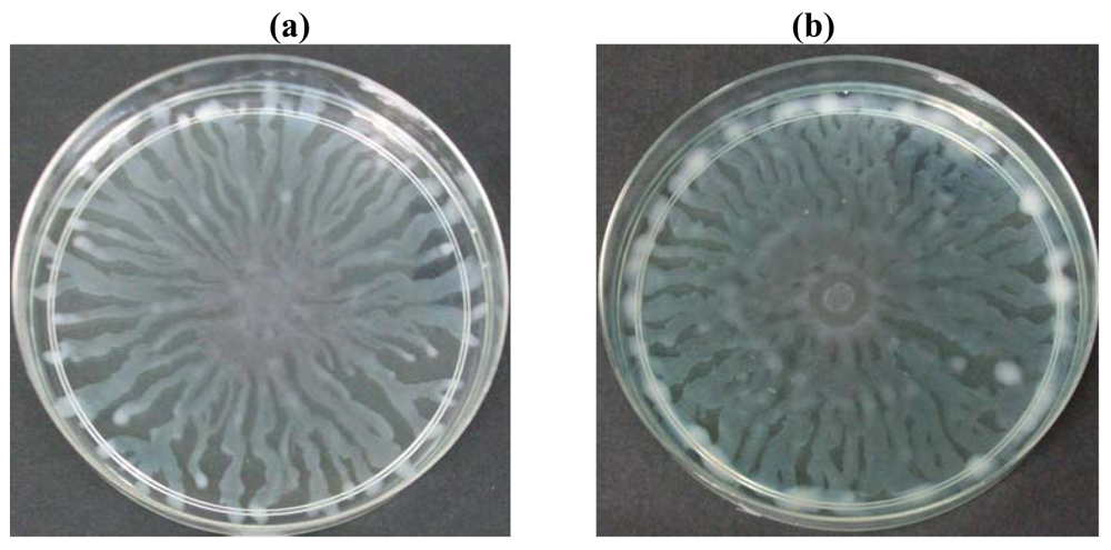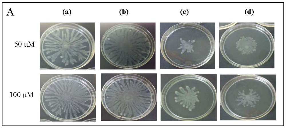 The swarm plates of P. aeruginosa PAO1 were prepared using 0.5% Bacto agar, 0.5% peptone, 0.2% yeast extract and 1.0% glucose, per 100 ml distilled water [26]. A 250 μL of sterile clove extract was seeded with 5 mL of the agar and poured immediately on a 10 mL of pre-warmed agar plate as an overlay. Two microliters of the P. aeruginosa PAO1 culture was inoculated at the center of the agar surface and the plate was incubated for 16 hours at 37 °C. To determine whether exogenous supplied AHLs could restore P. aeruginosa PAO1 swarming motility, warm swarm agar was added with C4-HSL), 3-oxo-C12-HSL or both. AHLs were applied at the concentrations of 50 μM and 100 μM.