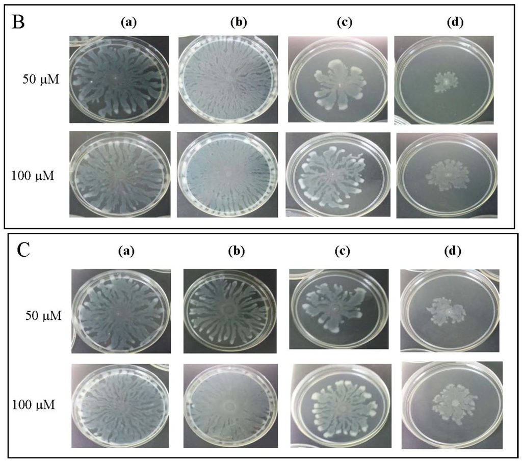 To further explore anti-QS potential of clove extracts, further assays were done on inhibition of P. aeruginosa PAO1 swarming and pyocyanin production. The hexane, chloroform and methanol extracts of clove were assayed for inhibition of P. aeruginosa PA01 swarming motility. Maximum reduction of swarming was observed in the swarming plates containing clove methanolic extract followed by chloroform extract compared with control (DMSO) while hexane extract showed no observable reduction (Figure 5). We further verified whether P. aeruginosa PA01 swarming could be restored by the addition of exogenous AHLs (C4-HSL, 3-oxo-C12-HSL, and both; applied at 50 μM and 100 μM). It is clearly shown that clove methanolic extract displays consistent swarming motility inhibition regardless of the types of AHLs supplemented to the swarm agars (Figure 6). C4-HSL and 3-oxo-C12-HSL were chosen because P. aeruginosa PA01 employs these AHLs as its natural QS molecules to control various QS-mediated phenotypes. We further demonstrated that even when both AHLs were added at a very high concentration (100 μM), swarming of P. aeruginosa PA01 was not restored significantly (Figure 6). Addition of high concentration of AHLs failed to restore swarming of P. aeruginosa PA01 leads to the speculation that clove extracts may contain active molecules that show anti-QS activity that may not compete with AHLs to bind the cognate receptor at the same active site. This, however, requires further work on studying the interaction of clove extracts and P. aeruginosa PA01 luxI and luxR homologues.