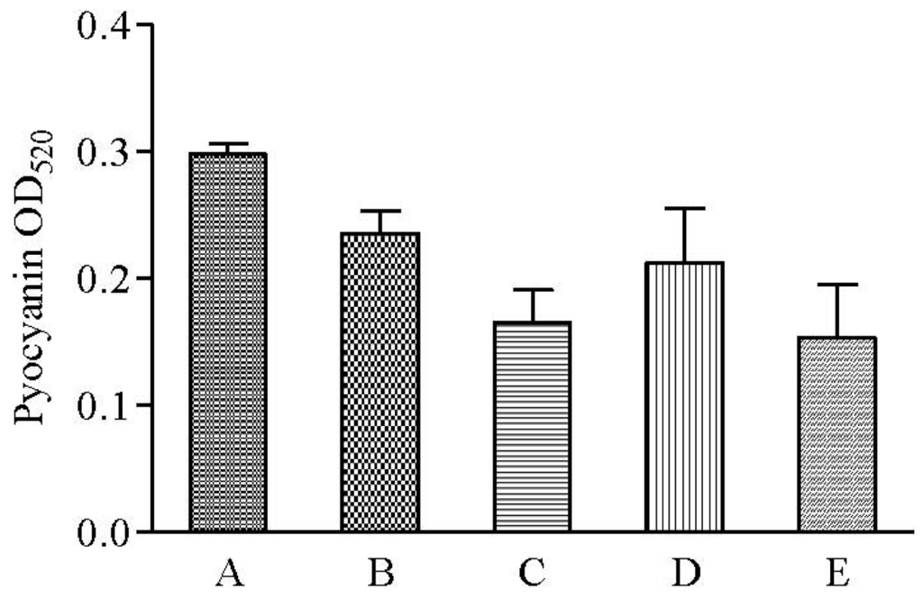 QS-regulated swarming motility has been characterized as form of flagella-dependent movement on a viscous environments such as semi-solid agar surfaces while pyocyanin is characterized as a blue pigment and redox-active phenazine compound that generate reactive oxygen intermediates [28,29]. Hexane and methanolic but not chloroform extracts of clove showed reduction in pyocyanin formation (Figure 7). Both swarming and pyocyanin are produced and regulated by the rhl system in P. aeruginosa [30,31]. Therefore, collectively inhibition of P. aeruginosa PAO1 swarming motility and pyocyanin production suggests the presence of rhl inhibitor in the clove extracts.