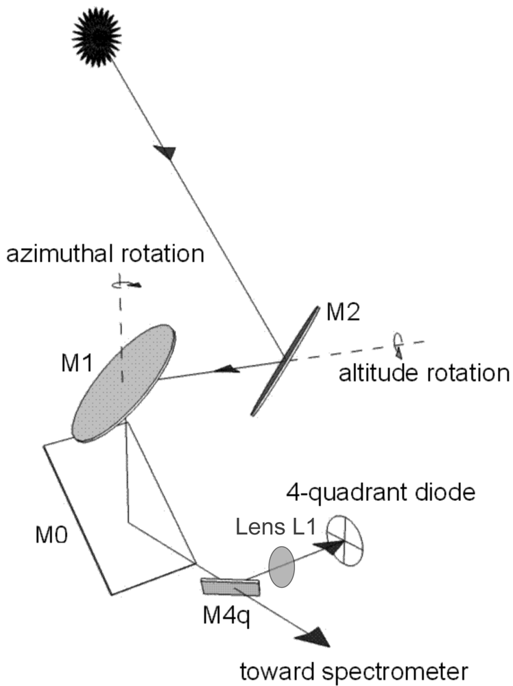 Figure 1 shows a popular altazimuthal tracker design. It consists of two elliptical mirrors held in 45 degrees relative to the vertical, facing each other (M1 and M2). Both M1 and M2 rotate along the azimuthal axis and M2 rotates as well around a horizontal axis (altitude direction). M0, and possibly other fixed mirrors, direct the light beam into the spectrometer optical axis. A 4-quadrant photodiode is used as a position sensor for a closed-loop control of the mirrors position once their positioning towards the Sun has been set with enough accuracy, i.e., once the Sun's image is visible by the photodiode. This altazimuthal setup is used with FTIR systems, e.g., in Kiruna [10] and Park Falls, Wisconsin [11]; it has been installed in Harestua to replace the equatorially mounted system [12]. Compact versions have also been developed for field campaigns [13,14]. A commercial version is sold by Bruker to be installed on their FTIR spectrometers [15]. A recent progress in the pointing accuracy has been reported [16], replacing the traditional quadrant diode with a CCD camera, but the problems discussed hereafter remain the same.