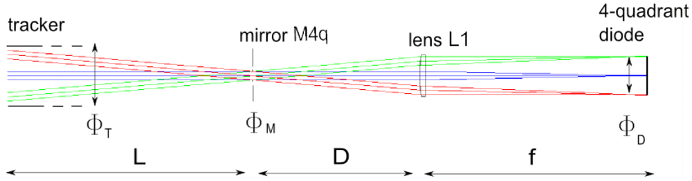Figure 2 shows the typical optical scheme between the tracker and the quadrant diode, the optical axis has been aligned for the sake of clarity. The distance L is measured from the first mirror which reflects the sunlight, i.e., M2 in Figure 2. Close to the spectrometer, a part of the beam from the tracker, with diameter ΦT corresponding to the small axis of M1 and M2 on Figure 2, is deflected by a mirror of diameter ΦM to a lens which focuses the beam onto the quadrant. The maximum field-of-view seen by the diode (FOV1) depends on the focal length of the lens (f) and on the diameter of the quadrant (ΦD), according to . The lens L1 is unlikely to reduce the FOV assuming its size superior to the mirror's one. Indeed, the beam is parallel before the lens which implies that distance D can be reduced if necessary. The tracker aperture, in our case defined by the azimuthal stage free aperture, is more important, especially since the diameter of a rotation stage is limited and the distance between the tracker and the deflecting mirror (M4) depends on the observatory configuration. The mirror's FOV due to the tracker is .