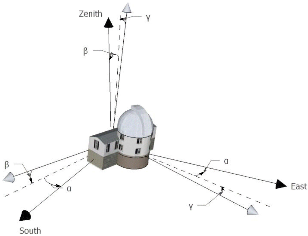 Euler angles of an observatory may be seen, as in Figure 3, as consecutive rotations around three orthogonal axes needed to account for the pitch, roll and yaw of this observatory Converting the solar altitude and azimuth to the observatory frame requires thus to compute the multiplication of three rotation matrices along the different axes, i.e., Rx(γ), Ry(β) and Rz(α). The resulting matrix Moffset expresses the transformation of coordinates due to the Euler angles.