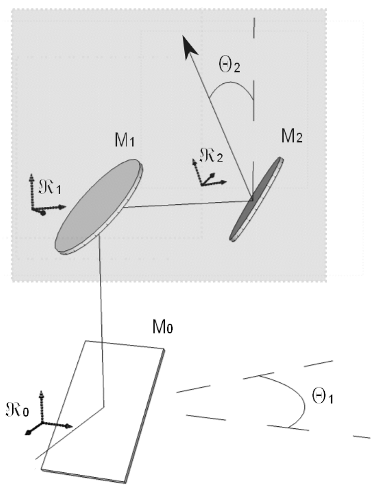 Figure 4 presents the tracker pointing to an azimuth θ1 and a zenith angle of θ2. The reference frames ℜ1 and ℜ2 are respectively attached to the mirrors M1 and M2, with the x axes in the direction of their small semi-axes and the y axes along the line joining the two mirrors. The optical system inside the frame, with only mirrors M1 and M2, can be expressed as a transformation whose matrix Mtracker is: