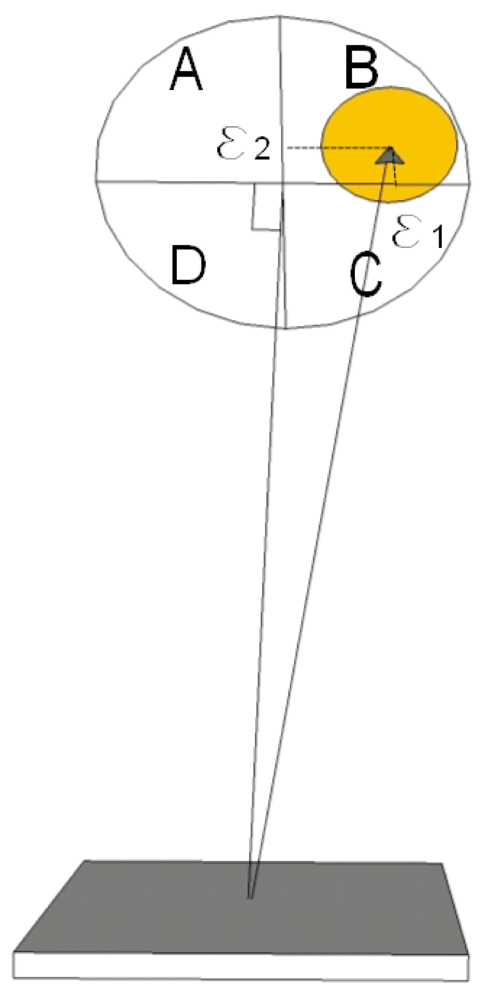 The transformation expressed by Mtracker can now be applied to a vector corresponding to the Sun light beam direction on the spectrometer side of the tracker. It will lead to the position of the Sun in Cartesian coordinates. The vector is built from the 4 diode signals (VA,VB,VC,VD), as represented in Figure 5. Basically an offset position (ε1,ε2) is computed for the Sun spot on the diode plane compared to its center by: