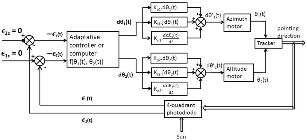 From a control theory perspective, the altazimuthal tracker and its feedback is a non-linear multi-input multi-output (MIMO) system. Indeed, two outputs defining the pointing direction (θ1 and θ2) are controlled by two inputs, i.e., the coordinates of the Sun spot on the photodiode(ε1 and ε2), and the relationship between the inputs and the outputs varies with the position of the tracker. However, having modeled this relationship in the previous section, it is possible to change the feedback scheme while tracking. In control theory, this is an example of adaptive control.