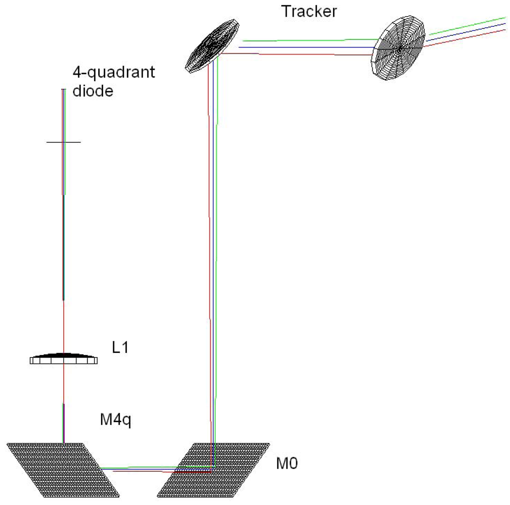 In practice, the quadrant vector may differ from (ε1,ε2,Λ) due to reflections such as on the mirrors M0 and M4q on Figure 1, necessary to deviate a part of the beam to the 4-quadrant photodiode. Defining the position vector thus requires to pay attention to the optical path from M1 to the photodiode. In section 4, we explain how we deal with the problem in our particular case.