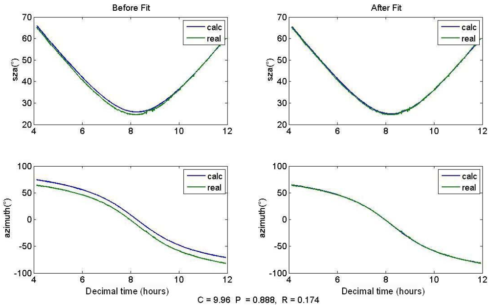 Figure 8 shows a fit of the Euler Angles. The track was performed on 12 September 2011 in Saint-Denis. The left panel shows the calculated mirror positions neglecting Euler Angles, together with the actual ones when the active tracker was operational. Weather was clear-sky and enabled to record a long Sun path, demonstrating the capacity of the active tracking algorithm described in Section 2.3. Around one hundred points were extracted from the log file of the tracker position and used to fit the Euler Angles with an unconstrained nonlinear minimization. The three angles α,β and γ described in Section 2.2 were respectively estimated to be 9.96°, 0.888° and 0.174°. The right panel shows how these fitted angles improve the calculated Sun position. The maximum offset between calculated and actual position is now 0.5°, i.e., 9 mrad, which is under the 20 mrad of the photodiode's FOV. Providing this accuracy in the calculated mode, the tracking system is able to set the Sun's image onto the 4-quadrant photodiode and then start the active tracking without the need of an operator.