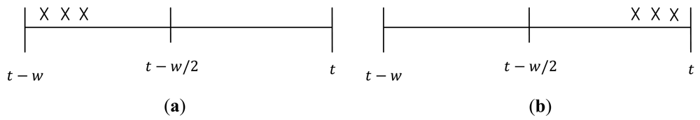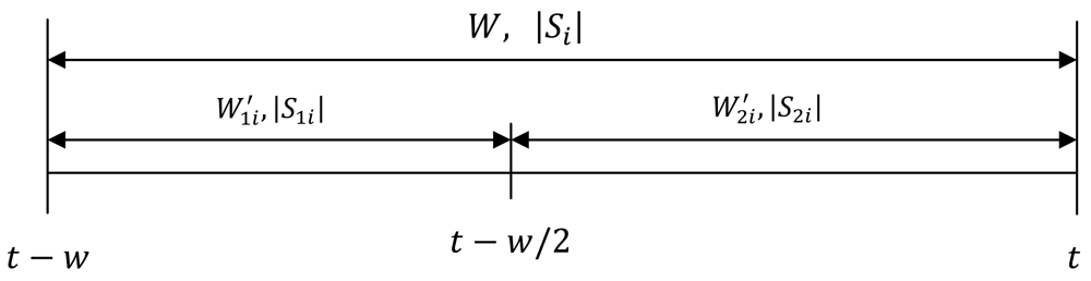 Assume Wi = (t − wi, t) is tag i current window, and let W1i′ = (t − wi, t − wi/2) denote the first half of window Wi and W2i′ = (t − wi/2, t) denote the second half of the window Wi. Let |S1i| and|S2i| denote the binomial sample size during W1i′ and W2i′ respectively. Note that the mid epoch (i.e., epoch at t − wi/2) in inclusive on both range as shown in Figure 1.