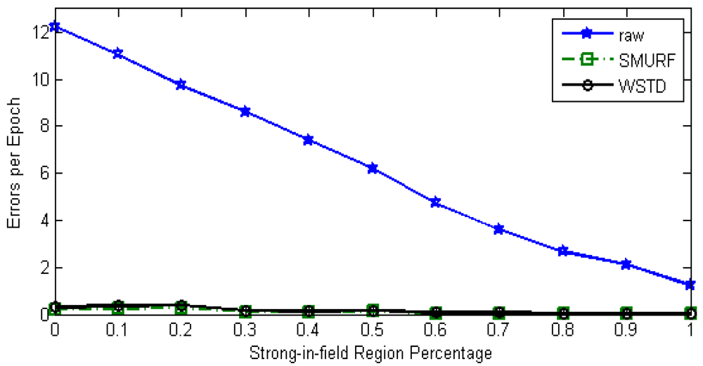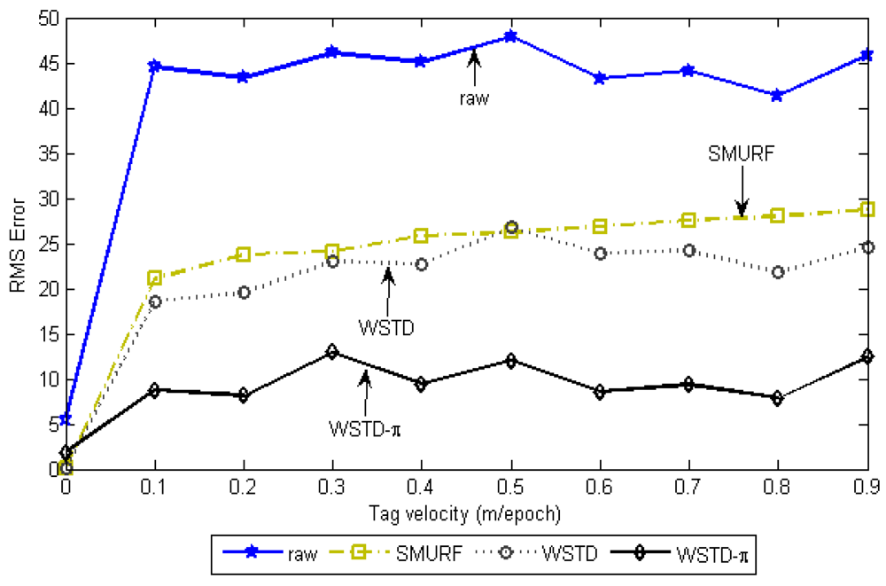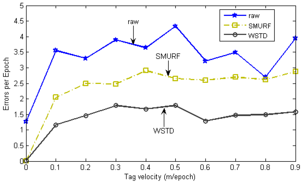 In this experiment we determine how each technique reacts to different levels of environment unreliability with the randomly moving tags. Each tag is moved with its own random velocity between 0 to 90 cm/epoch and after every 100 epochs on average the tag change its state from moving to rest state and vice versa. When the tag resumes movement it chooses another random velocity, this movement pattern is referred as Fido in [16]. The strong-in-field region percentage is varied between 0 and 100%. The lower StrongPercentage corresponds to unreliable environment and higher values of StrongPercentage corresponds to a more controlled environment. At each StrongPercentage we measure the average errors produced by each scheme. The average error per epoch is calculated as . Figure 6 shows the result of this experiment, the “raw” trace is truncated to enable clear view of other traces.