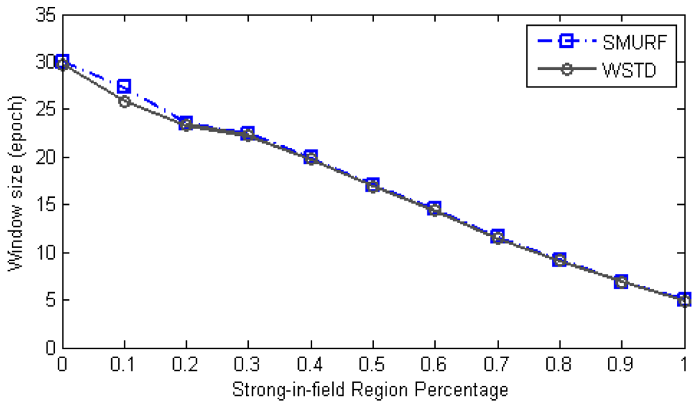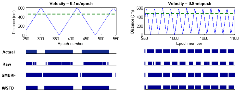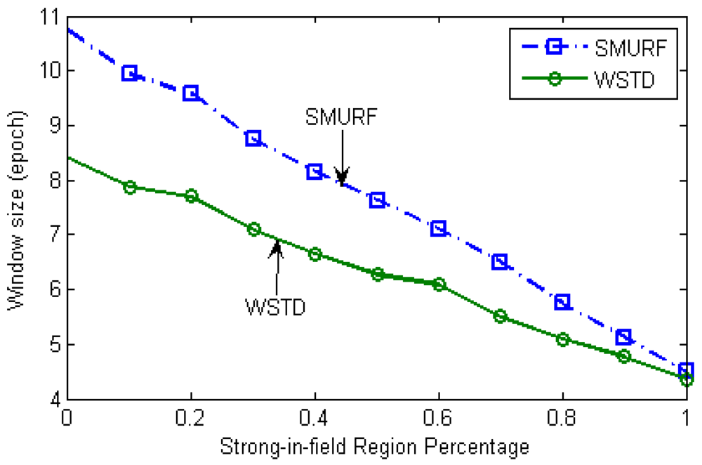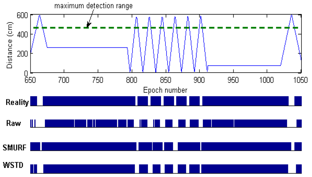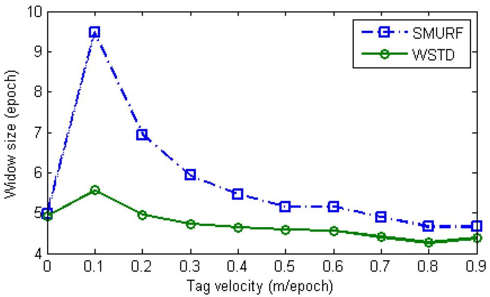 Setting the minimum window size to three epochs strikes a balance between maintaining the smoothing effect of the algorithm and reducing the false positive errors. Similar to SMURF, WSTD also slides its window per single epoch (read cycle) and produces output readings corresponding to the midpoint of the window after the entire window has been read.