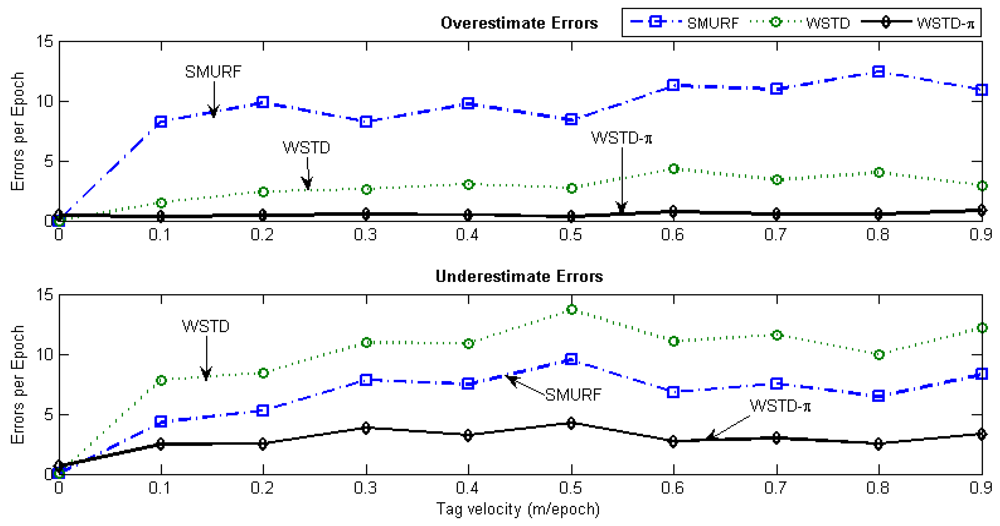 Figure 17 shows the average number of overestimate and underestimate tag counts for the cleaning schemes and Figure 18 shows their average cleaning-window sizes as the tags' velocity is varied. The WSTD-π scheme has the smallest number of underestimate and overestimate errors and it also uses the smallest average cleaning-window sizes compared to other variable window schemes. The WSTD-π small overestimate errors are attributed to its smaller window size while its small underestimate errors are attributed to its use of π-estimator to estimate the number of tags.