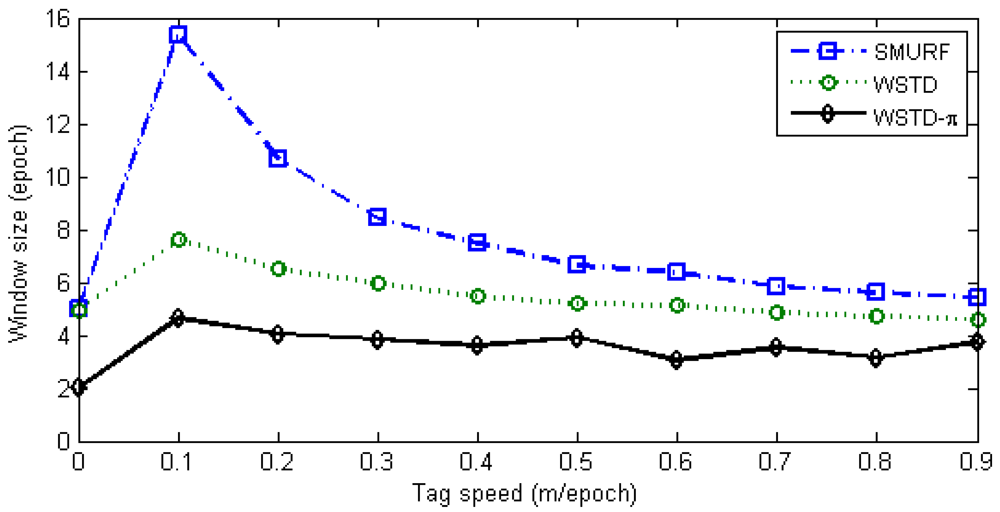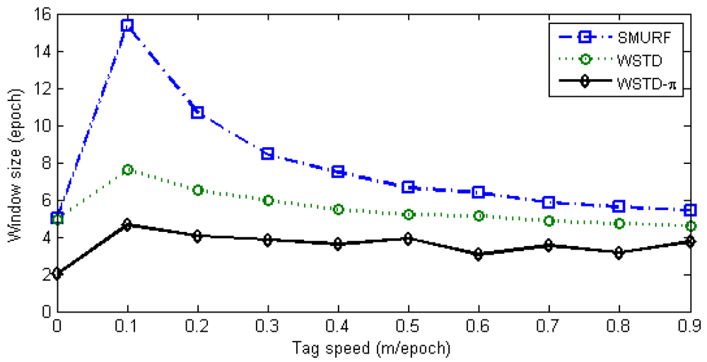 The WSTD scheme performs better than SMURF producing an improvement of approximately 30% less overall errors in comparison to that produced by SMURF. This performance improvement is attributed to its improved transition detection as shown in Figure 12, due to its use of small window sizes as shown in Figure 13. The cleaning-window sizes decreases with the increase in tag speed.