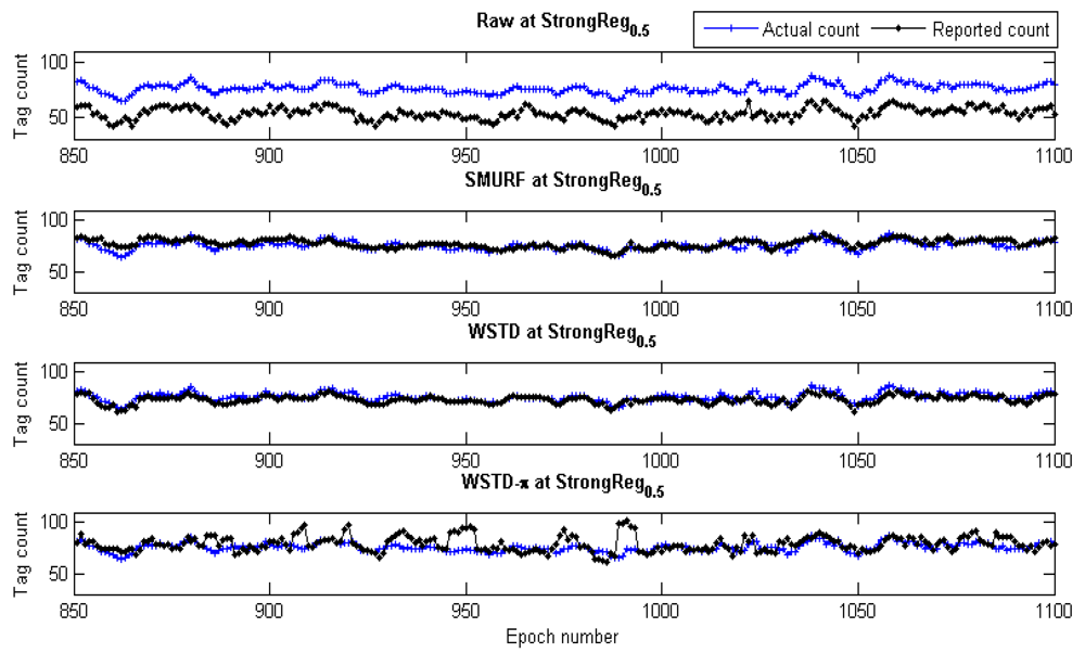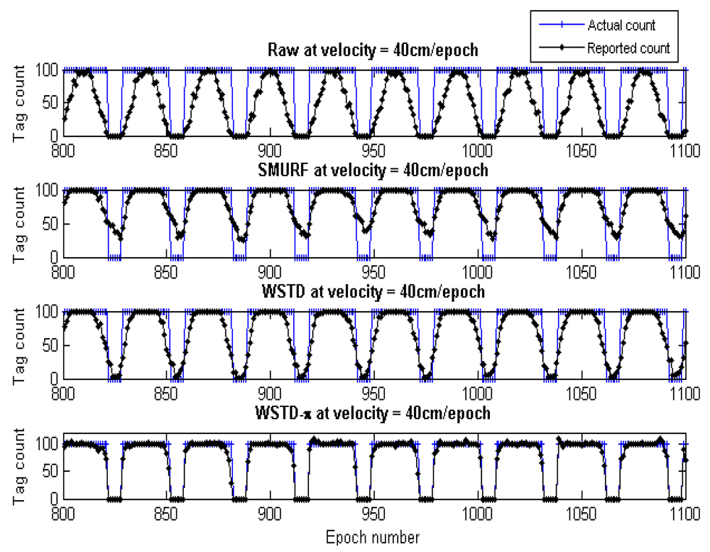 Although we used an average number of overestimate and underestimate tag counts per epoch as a metric to compare the performance of these schemes, we noticed that most of the undercounting errors occur during the transition periods. This is caused by the nature of algorithms whereby the window size is reduced when an exit transition is detected. While this measure limits the false positive errors, it also leads to false negative errors due to resulting small window size in case of premature exit transition detection. In addition, when the tags are entering the detection region on the far edge of the detection range due to a small window size and a weak read rate, leads to a high number of undercounting errors. Figure 19 shows the comparison of the reported estimated tags count and that of the actual tag count for the three variable window schemes SMURF, WSTD and WSTD-π with the tags moving at a velocity of 0.4 m/epoch. WSTD-π provides close accurate tag-count estimation compared to other schemes.