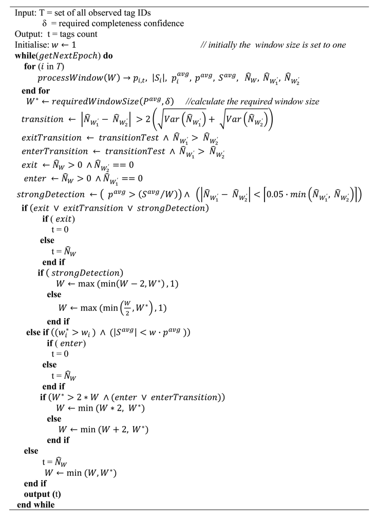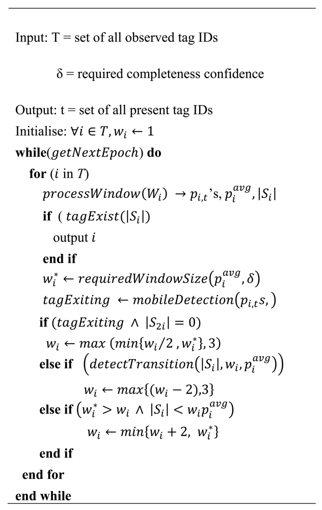 The per tag cleaning method could be used to clean tags in such scenarios, where by each tag in the population is individually cleaned and their result is aggregated across individual smoothing filters for each epoch. However, this solution can be highly affected by poor performing tags especially in the static environment. The per tag cleaning algorithm adapts the window size for each individual tag and because window sizes for individual tags might be different, based on their detection rates, the decision on whether the tag is present or not is taken at different epochs. Therefore, due to different window sizes, the tags that are not ready for processing (i.e., the readings for all epochs in its window have not be accumulated) will delay the output. To avoid this limitation caused by low performing tags, the multi-tag cleaning algorithm uses the same smoothing window for all the tags together with a statistical estimation technique to accurately estimate the tags population count without cleaning on a per-tag basis.