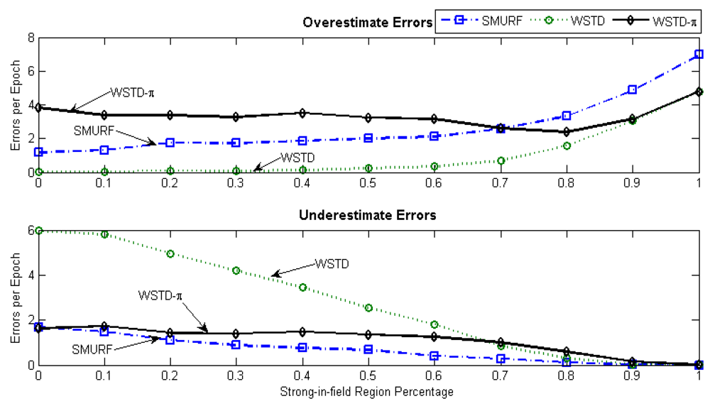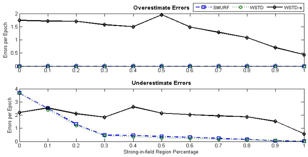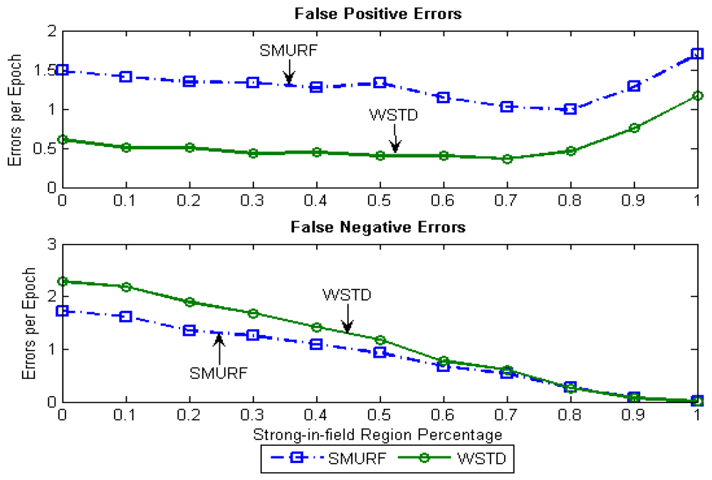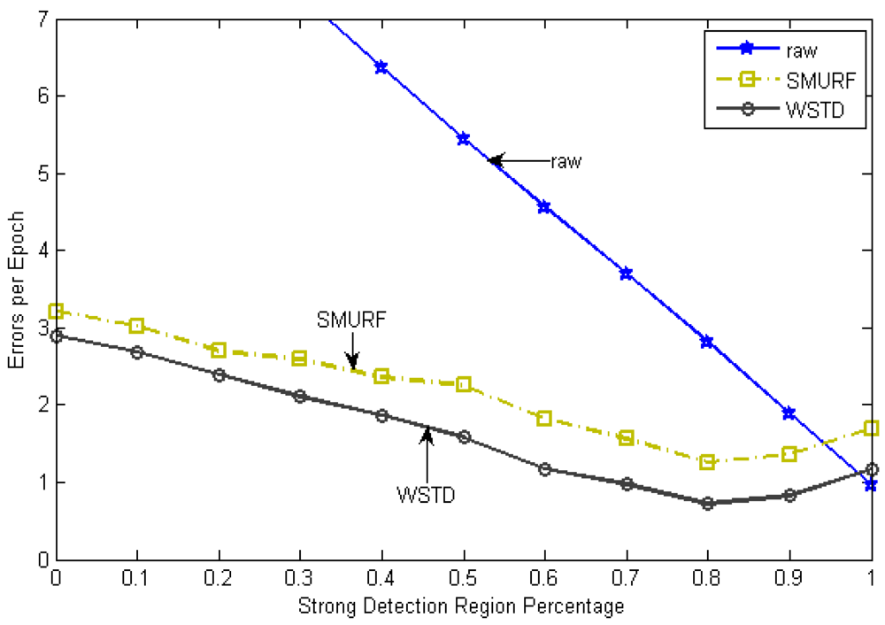 Because of its small window size, WSTD is more efficient in detecting transition than SMURF; however, it also produces slightly more negative errors than SMURF as show in Figure 9. The increase in false negative errors in the noisy environment by WSTD can be associated with the premature transition detection by rule2 of the WSTD algorithm. As the noise decreases, their performance in compensating for missed readings become competitive and their difference decreases.