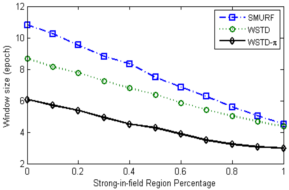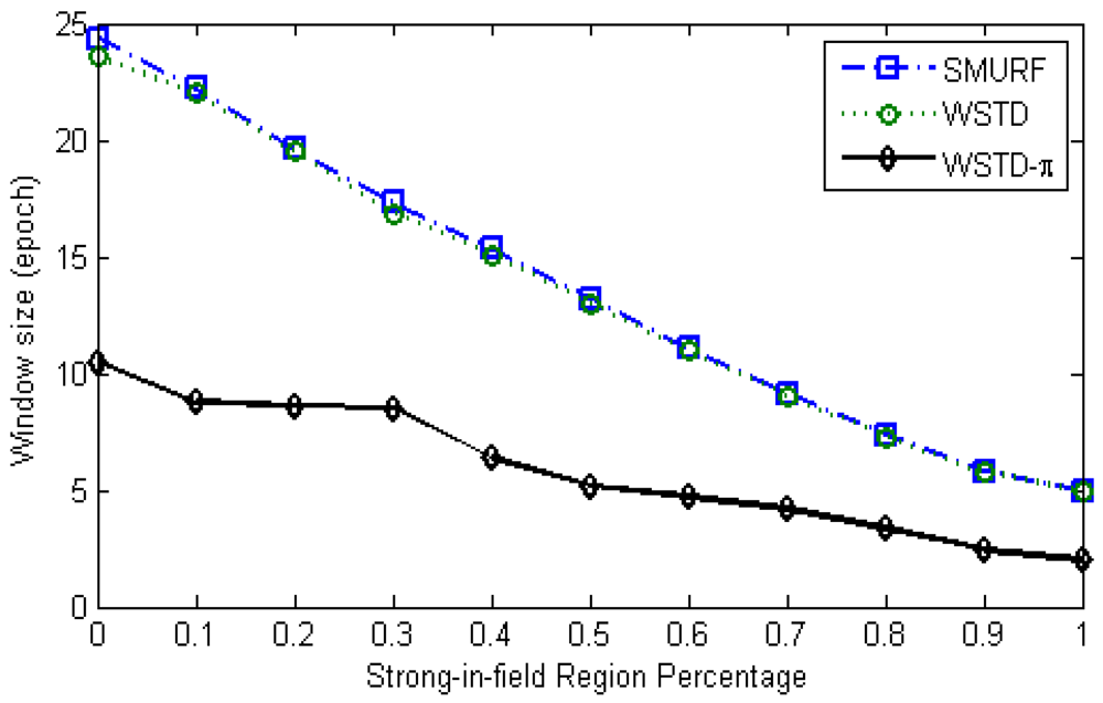 By taking advantage of the π-estimator, which scales-up the reading in the window to estimate the underlying tag population, we can reduce the window sizes to enhance transition detection, hence the minimum window size can be reduced to 1 epoch. We introduce another estimation condition, which we call strong region detection. The aim of strong region detection is to detect when the tags within the window are observed with high probability of detection and when there is no significant variation in tag population within the two window sub-ranges.