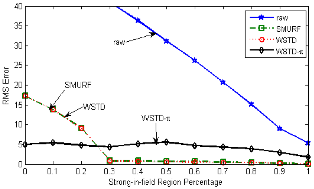 In this experiment we determine how each multi-tag cleaning technique reacts to different levels of the environment's unreliability with the randomly moving tags. The experimental parameters are the same as the ones used for the individual tag-cleaning experiment, except that in this experiment we used 100 moving tags instead of 25 tags. The strong-in-field region percentage is varied between 0 and 100% and at each StrongPercentage we measure the RMS errors produced by each scheme. Figure 20 shows the result of this experiment, “raw” trace is truncate to enable a clear view of other traces.