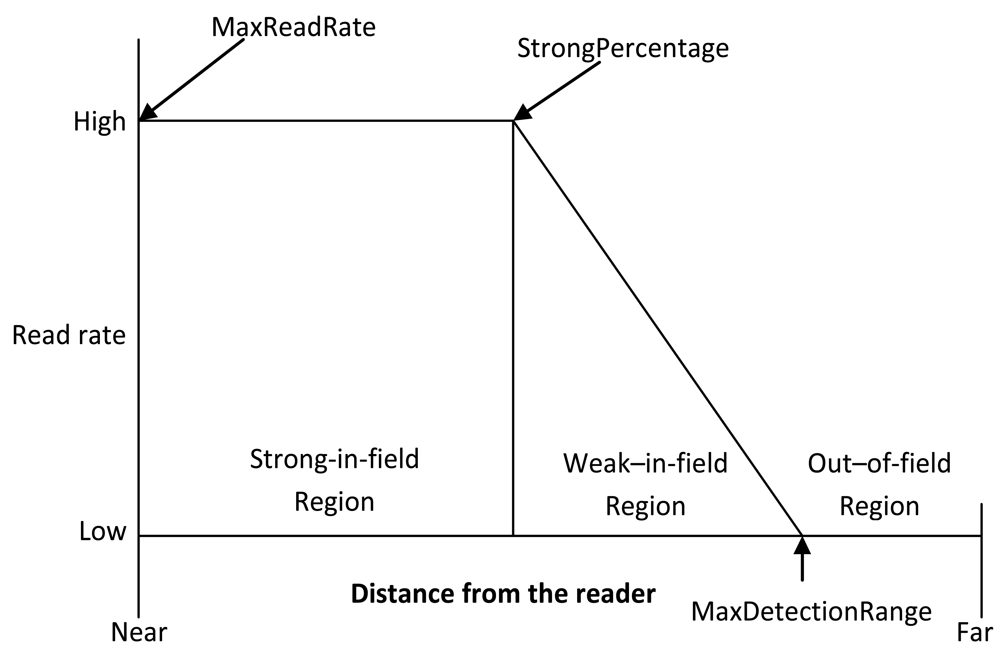 The reader detection model is based on the RFID tag-reader detections regions. Generally there are three distinct regions of operations of a passive RFID reader tag system: strong-in-field, weak-in-field and out-of-field regions [5,16,25], as illustrated in Figure 5.